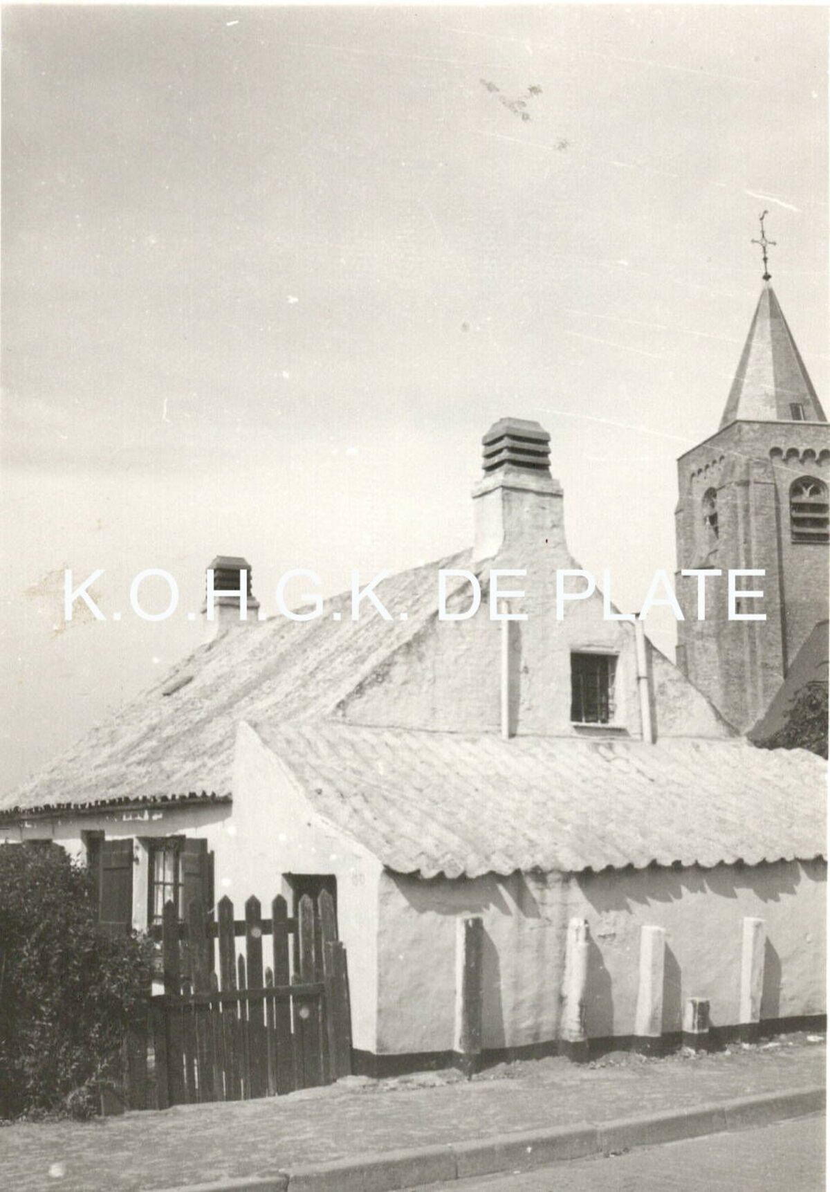 Formaat : 12 x 8 cm. - Ten westen van de Onze Lieve Vrouw Ter Duinenkerk is de omwalling van de verdwenen pastorie nog zichtbaar. Aan de zuidoostelijke hoek van het kerkhof, aan de Dorpsstraat 80, bevindt zich nog het laatst bewaarde witgeschilderd vissershuisje, gebouwd in 1822 voor de familie Corveleyn.