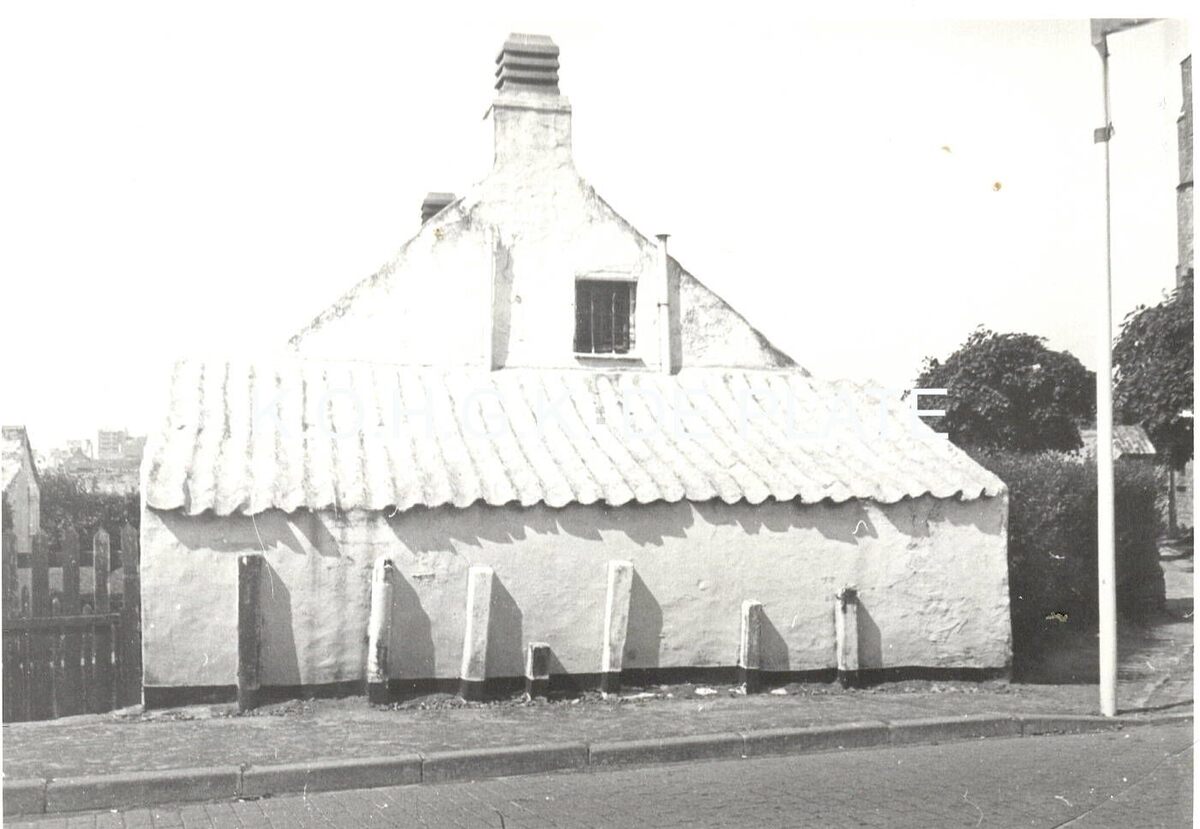 Formaat : 12 x 8 cm. - Ten westen van de Onze Lieve Vrouw Ter Duinenkerk is de omwalling van de verdwenen pastorie nog zichtbaar. Aan de zuidoostelijke hoek van het kerkhof, aan de Dorpsstraat 80, bevindt zich nog het laatst bewaarde witgeschilderd vissershuisje, gebouwd in 1822 voor de familie Corveleyn.