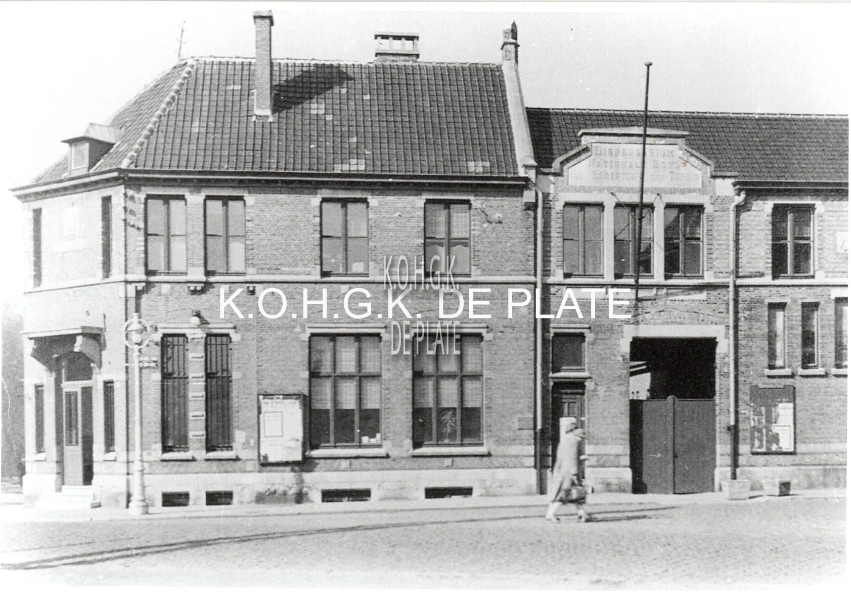 Formaat : 10 x 14 cm. - Foto uit de periode 1952-1975 - Dienstgebouw gelegen op de hoek van de Leffingestraat (links) en de Edith Cavellstraat (rechts). In dit gebouw waren ondergebracht : Het politiebureau "De Morre" van 1900 tot 1955, het dispensarium ter bestrijding van de tering en het mortuarium, in de volksmond "De Morre" genoemd. In 1968 werd het leegstaand gebouw ter beschikking gesteld van de "Vlaamse Vereniging voor Familiekunde (VVF)" die er haar lokaal had tot 1974.