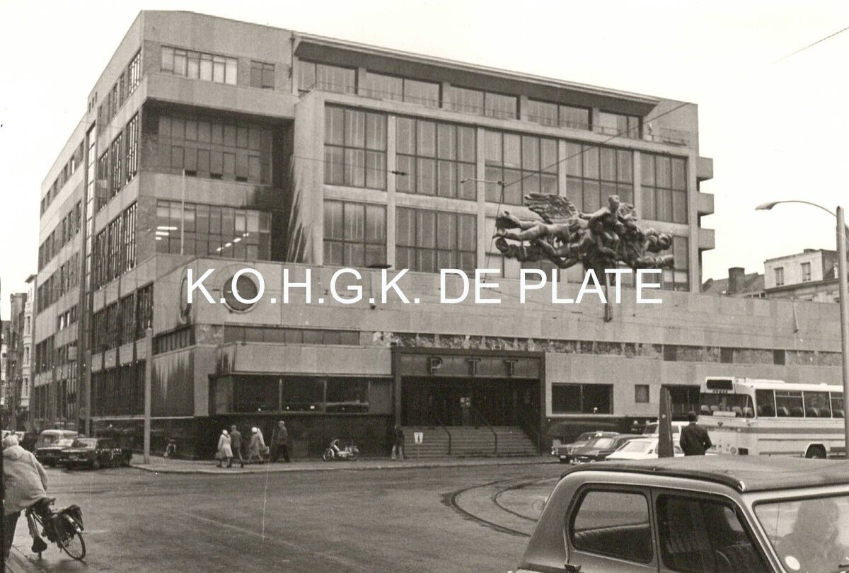 Formaat : 8,5 x 12,5 cm. - Voormalig postgebouw uit 1953 naar ontwerp van architect Gaston EysselincK.  Het gebouw is gelegen tussen de Wittenonnenstraat, de Aartshertoginnestraat, de Poststraat  met de ingang aan de Hendrik Serruyslaan. Op het front van de hoofdgevel zien we de sculptuur "De Communicatiemedia" of "Eenheid van de wereld door telefonie, telegrafie en postverkeer" van Jozef Cantré dat in 1963 geplaatst werd.