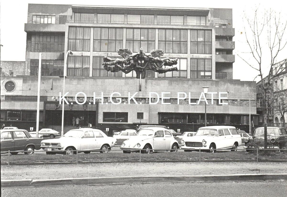 Formaat : 8,5 x 12,5 cm. - Voormalig postgebouw uit 1953 naar ontwerp van architect Gaston EysselincK.  Het gebouw is gelegen tussen de Wittenonnenstraat, de Aartshertoginnestraat, de Poststraat  met de ingang aan de Hendrik Serruyslaan. Op het front van de hoofdgevel zien we de sculptuur "De Communicatiemedia" of "Eenheid van de wereld door telefonie, telegrafie en postverkeer" van Jozef Cantré dat in 1963 geplaatst werd.