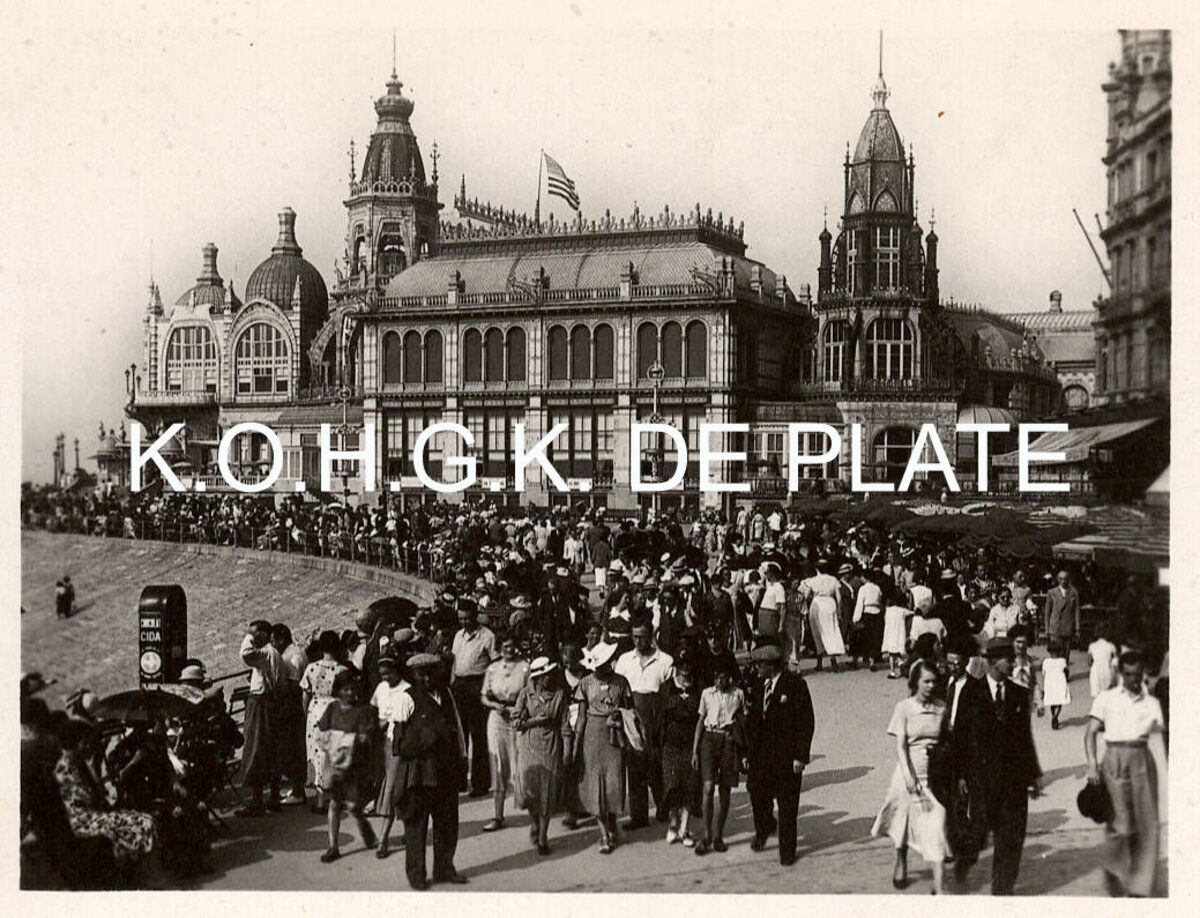 Formaat : 6 x 8,5 cm. - Veel volk op de Zeedijk tijdens een zomerse dag. We zien de westelijke gevel van de derde Kursaal. Dit plekje wordt "Petit Nice" genoemd. Men kan er van de zon genieten tijdens dagen dat een kille noord-oostenwind waait.
