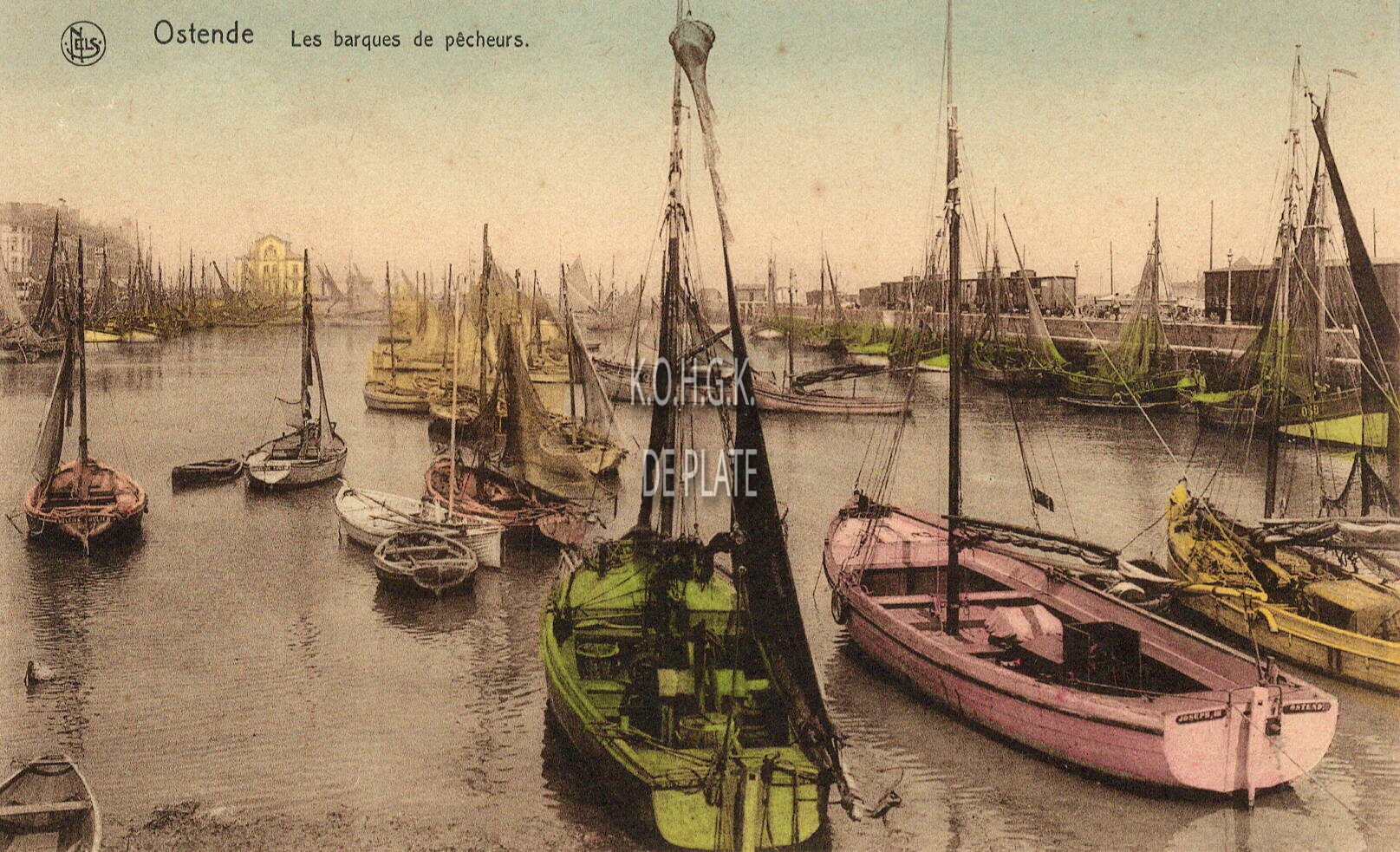 Nels. - Bijgekleurde kaart. - Ostende - Les barques de pêcheurs. Oostende - Visschersbooten. - Garnaalvissersvaartuigen gemeerd in het Schuildok. Links, de Visserskaai. Op het einde, links, het gebouw van de bestendige reddingsdienst.