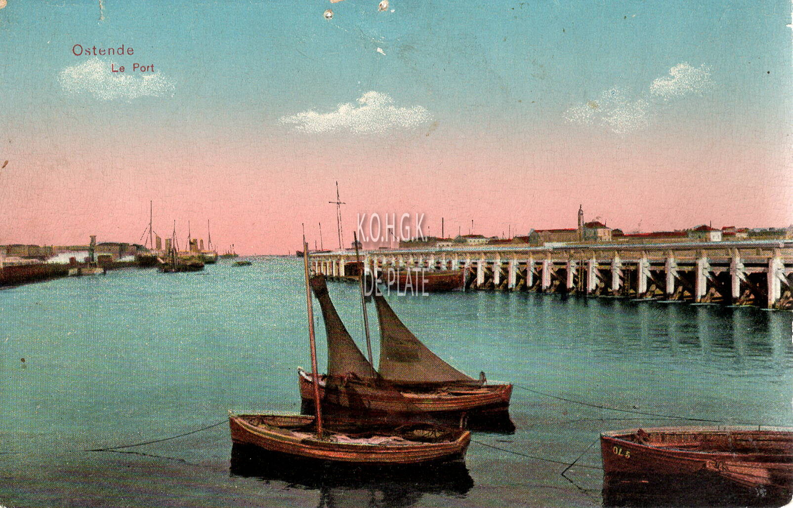 Edit. V.G.[= Victor Grégoire], 42, Avenue du Midi, Bruxelles. - Ostende - Le port. - Oostendse schovers gemeerd in de voorhaven. Wat verder links, pakketboten van de Oostende - Doverlijn gemeerd nabij het Zeestation. Rechts, de Oosteroever, met de oude Vuurtorenwijk en de tweede vuurtoren.