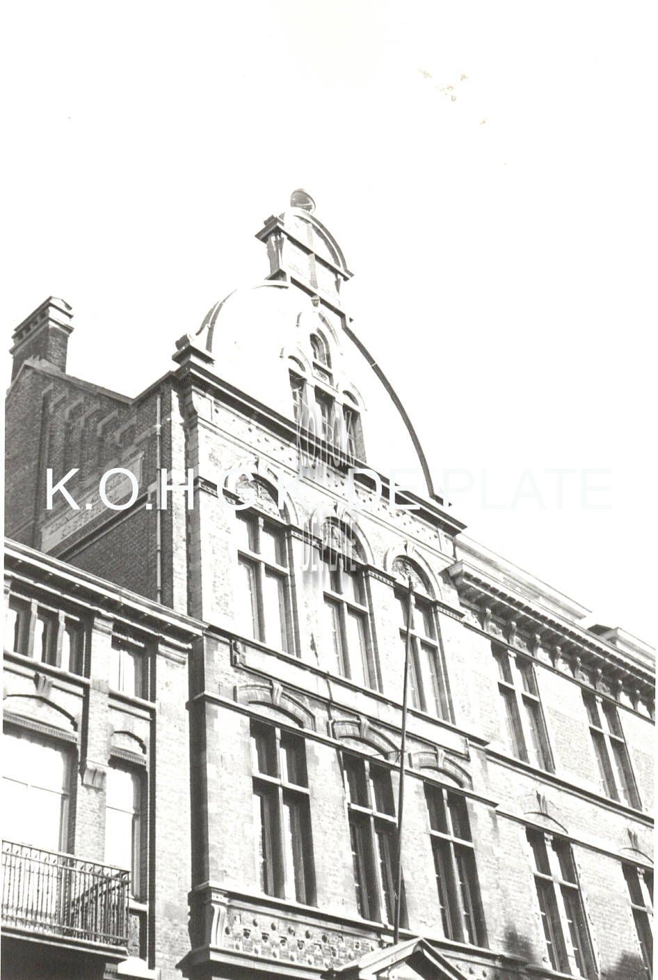 Formaat : 12 x 8 cm. - De kostschool in de Rogierlaan 10-12. - Schoolgebouw opgetrokken in 1900-1901 naar ontwerp van Joseph Caluwaers (atheneum) en Achille Raoux (kostschool); hiervoor worden enkele huizen en de Sint-Jozefskerk (1889) gesloopt.