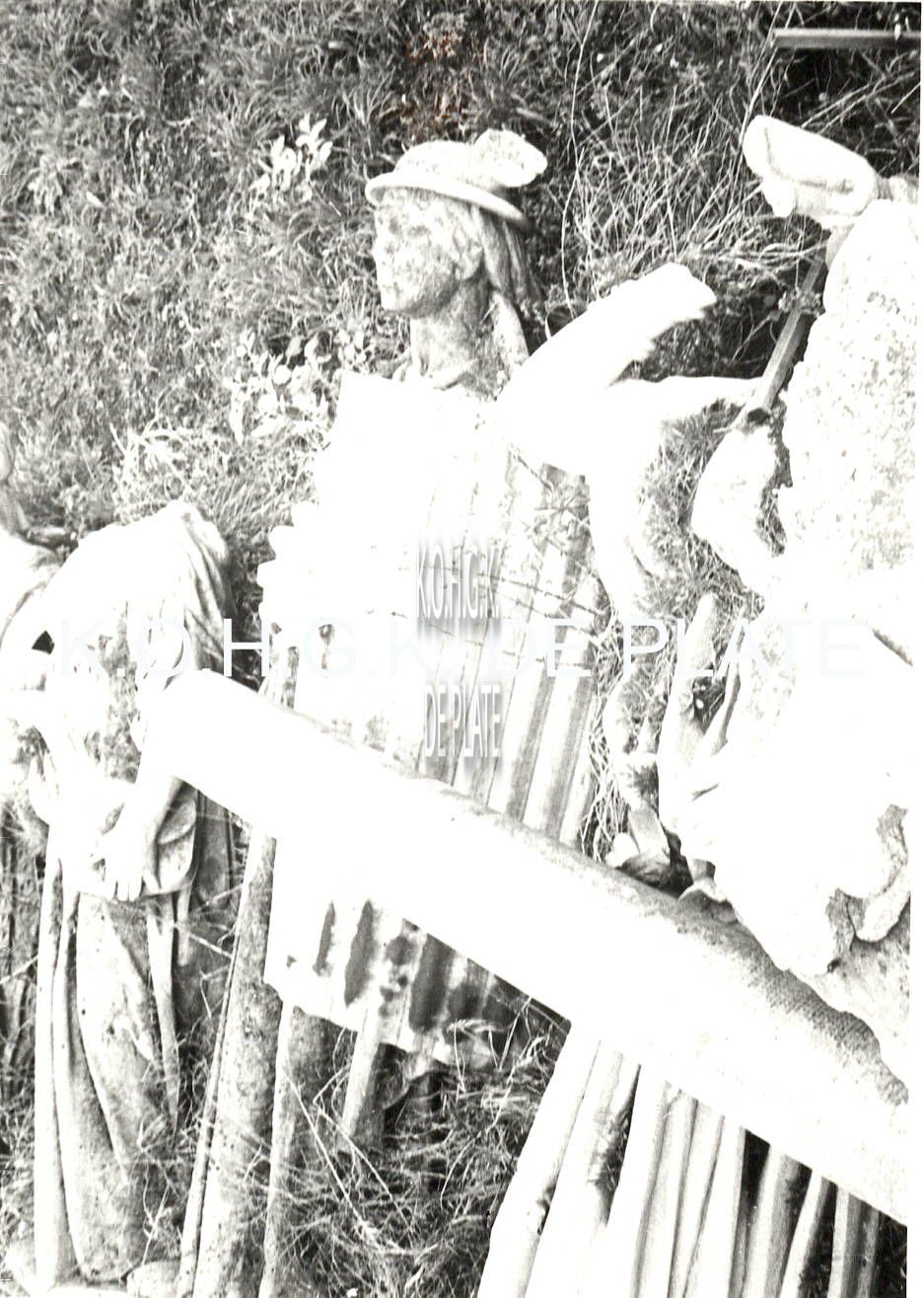 Formaat : 12 x 8 cm. - Deze beelden stonden tot 1944 op de gevel van het toenmalige postgebouw en kregen in 1984 een plaats in de middenberm van de Koninginnelaan