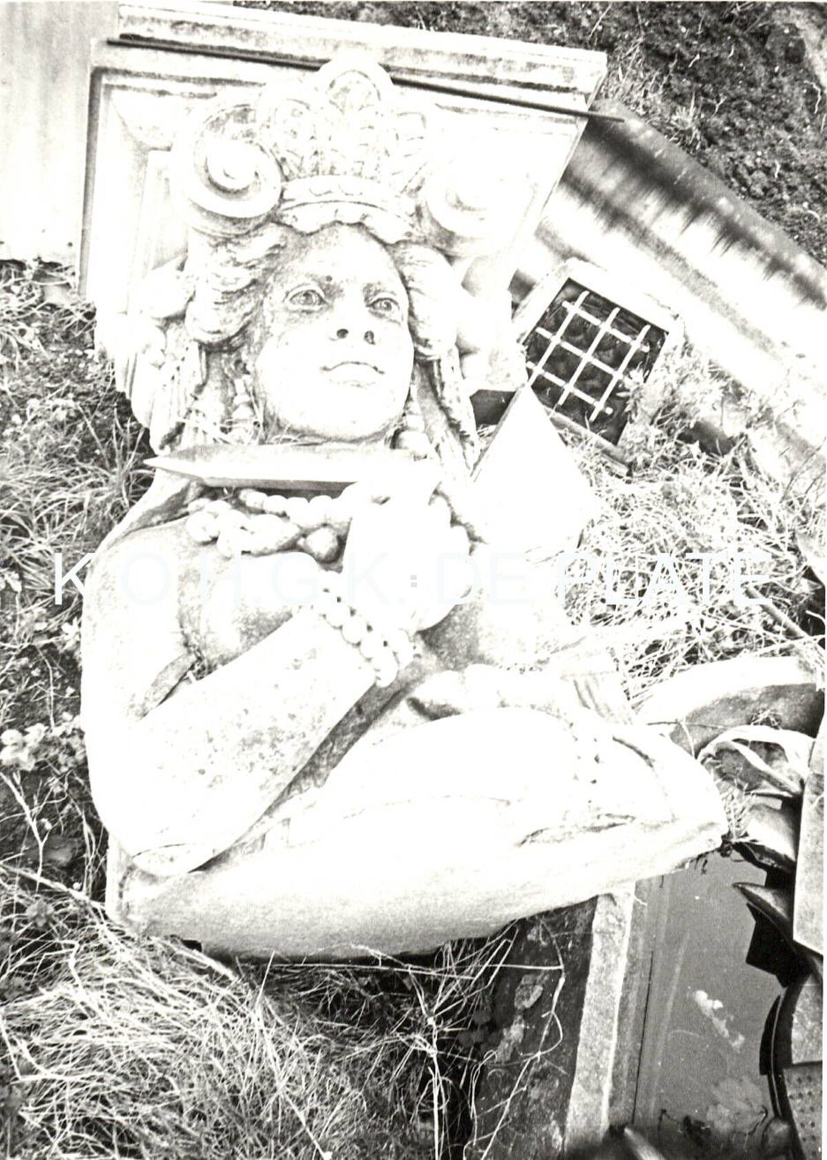Formaat : 12 x 8 cm. - Deze twee, 3 meter hoge, Kariatiden sierden de ramen van het gelijkvloers van het Grand Hotel de Bruxelles & New Claridge, de vroegere Villa Doris. Zij werden gemaakt door de Brugse beeldhouwer Hendrik Pickery (1828-1894) en verbeelden twee brazilaanse meisjes die op het hoofd de last van de voorgevel torsen. In 1988 werden de twee beelden teruggevonden en door de Stedelijke Diensten gerestaureerd. Zij staan thans in het Maria-Hendrikapark aan de voet van de oude watertoren