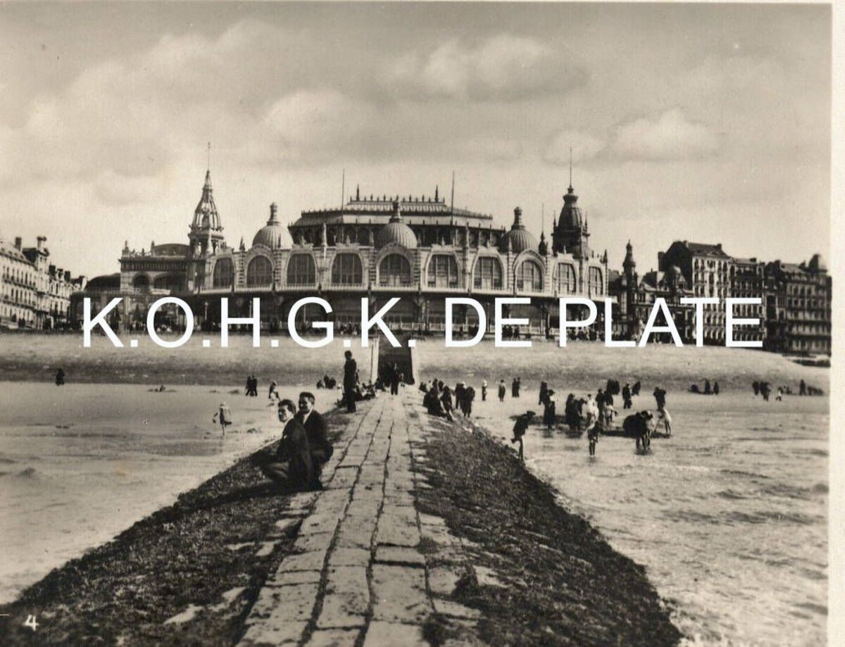 Formaat : 6,5 x 8,5 cm. - De noordgevel van de derde Kursaal langs de Zeedijk, gezien vanaf het Groot Strand op een golfbreker.