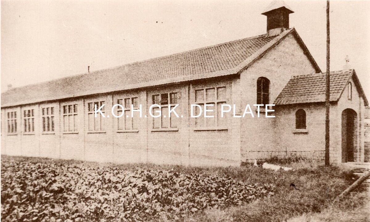 Formaat : 8 x 14,5 cm. - De in 1919 gebouwde "Noodkerk" van Mariakerke, waar de erediensten opgedragen werden tijdens de verbouwingswerken van het "Duinenkerkje". De "Barakke", zoals de noodkerk in de volksmond werd genoemd, was gelegen aan de Nieuwpoortsesteenweg, ter hoogte van de Lijsterbeslaan