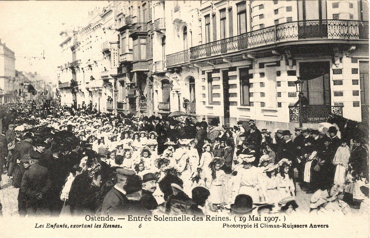 Formaat : 9 x 14 cm. - Ostende. - Entrée Solennelle des Reines. (19 Mai 1907). Les Enfants, exhortant les Reines. Phototypie H. Climan-Ruijssers Anvers.