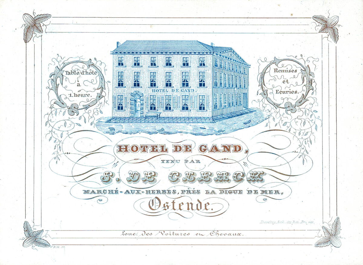 Formaat : 10,5 x 14,4 mm. - Hotel de Gand tenu par B.De Clerck, Marché-aux-herbes prés la Digue de Mer Ostende. Table d'hôte à 1 heure. Remises er Ecuries. Loue des Voitures en Cheveaux. Blauw ingekleurd.