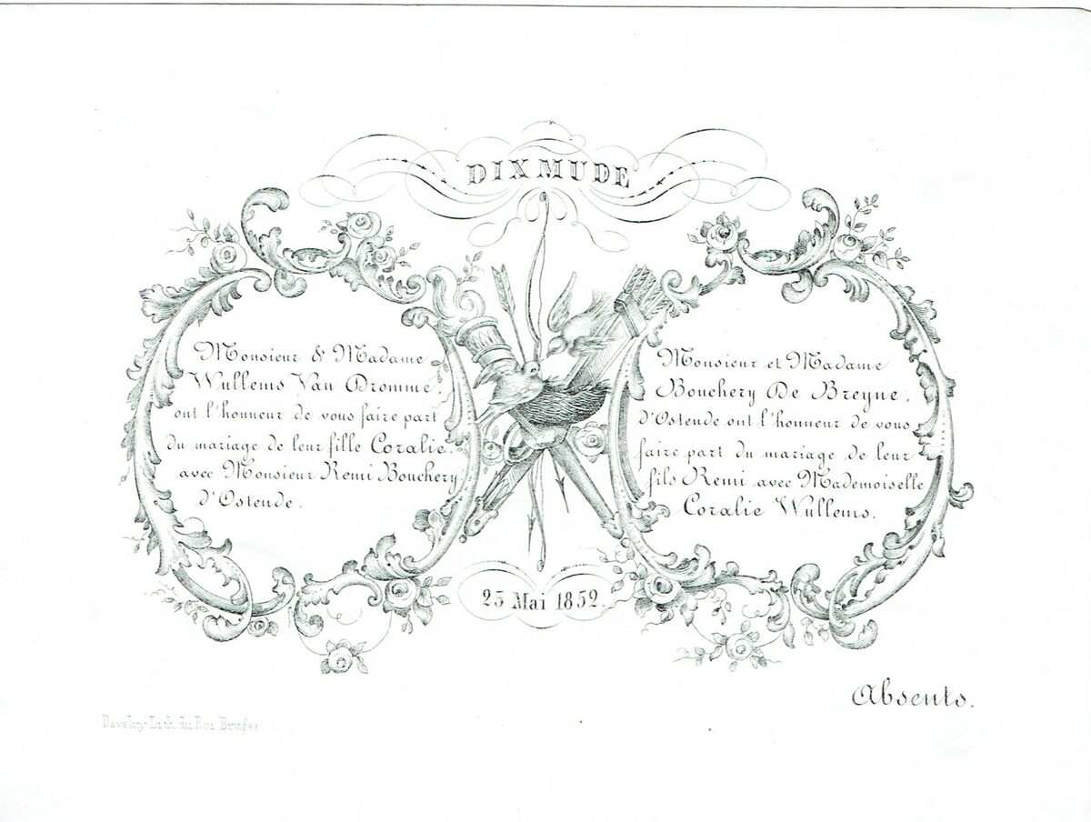 Formaat : 13,3 x 17,8 cm. - Monsieur & Madame Wullems Van Dromme ont l'honneur de vous faire part du mariage de leur fille Coralie avec Monsieur Remi Bouchery d'Ostende / Monsieur et Madame Bouchery De Breyne d'Ostende ont l'honneur de vous faire part du mariage de leur fils Remi avec Mademoiselle Coralie Wullems. - 25 Mai 1852