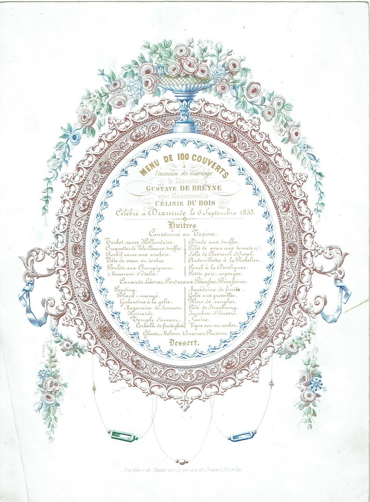 Formaat : 27 x 20,1 cm . - Menu de 100 couverts à l'occasion du mariage de Monsieur Gustave De Breyne avec Mademoiselle Céline Du Bois, célébré à Dixmude le 6 Septembre 1853