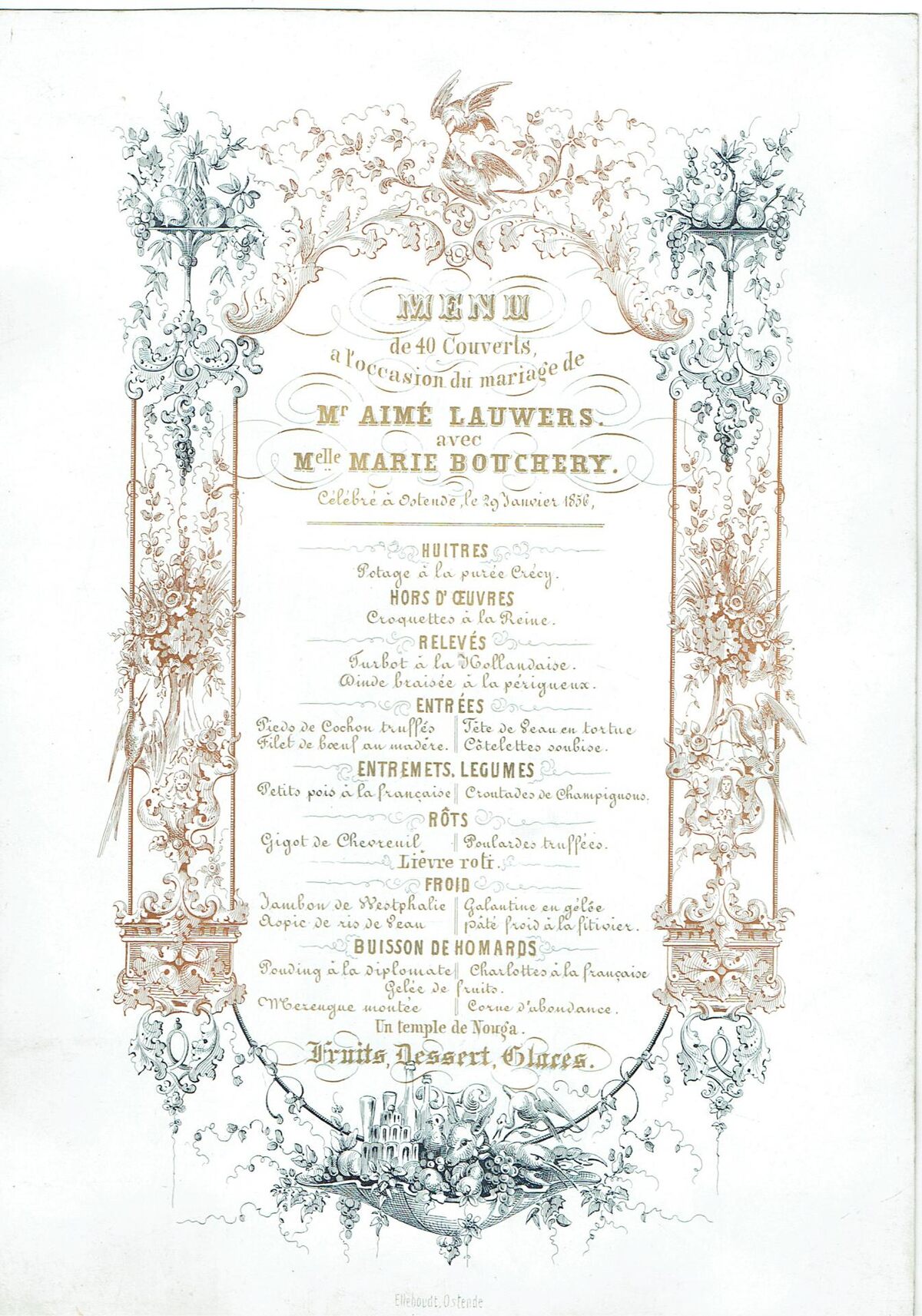 Formaat : 23,8 x 16,8 cm. - Menu de 40 couverts à l'occasion du mariage de Mr. Aimé Lauwers avec Melle Marie Bouchery. Célébré à Ostende le 29 Janvier 1856