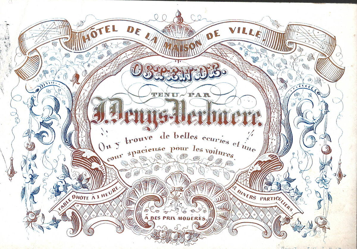 Formaat : 8 x 11,6 cm. - Hôtel de la Maison de Ville- OSTENDE. tenu par J. Denys-Verbaere. On y trouve de belle écuries et une cour spacieuse pour les voitures. Table d'hôte à l'heure - à diners particuliers - à des prix modérés.