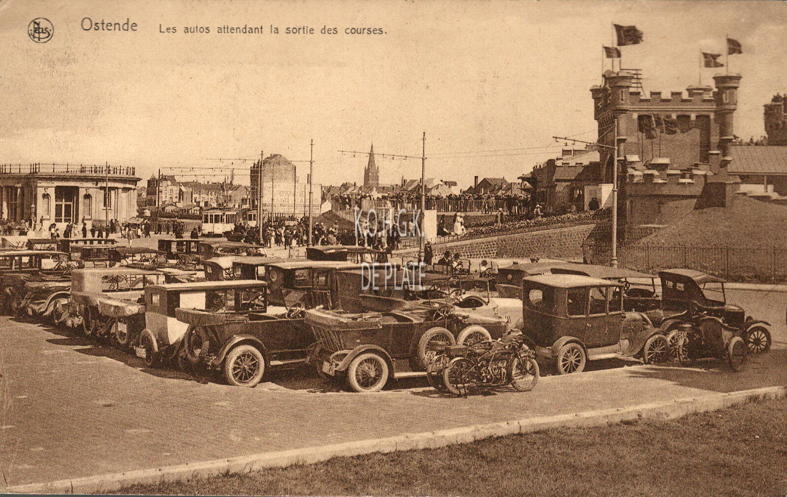 Nels + Ern. Thill, Bruxelles, Série 13, N° 75. - Een winderige zomernamiddag aan de Wellingtonrenbaan. Men kwam met de auto, motorfiets en met de tram naar de paardenrennen. Rechts, het fort Wellington dat de ingang was van de renbaan. Links, een gedeelte van de Koninklijke Gaanderijen langs de Zeedijk. Het gebouw in het midden is het sanatorium Sint Vincentius a Paulo in de Sport.