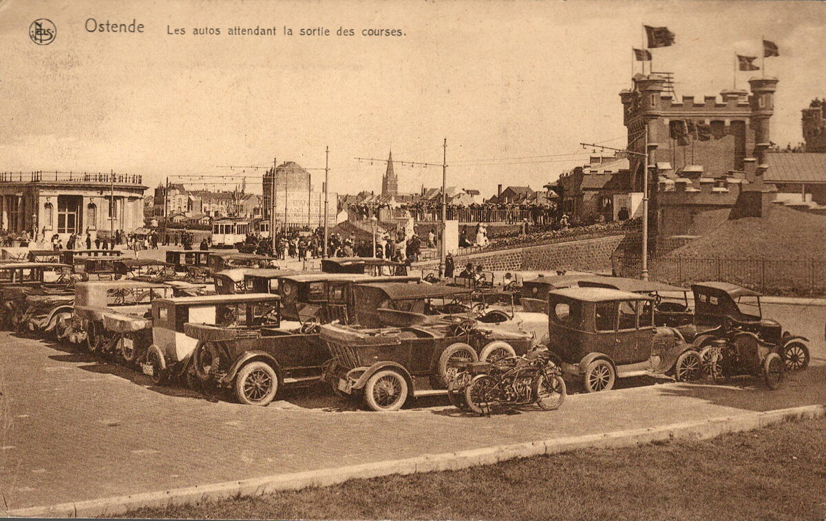 Nels + Ern. Thill, Bruxelles, Série 13, N° 75. - Een winderige zomernamiddag aan de Wellingtonrenbaan. Men kwam met de auto, motorfiets en met de tram naar de paardenrennen. Rechts, het fort Wellington dat de ingang was van de renbaan. Links, een gedeelte van de Koninklijke Gaanderijen langs de Zeedijk. Het gebouw in het midden is het sanatorium Sint Vincentius a Paulo in de Sport.