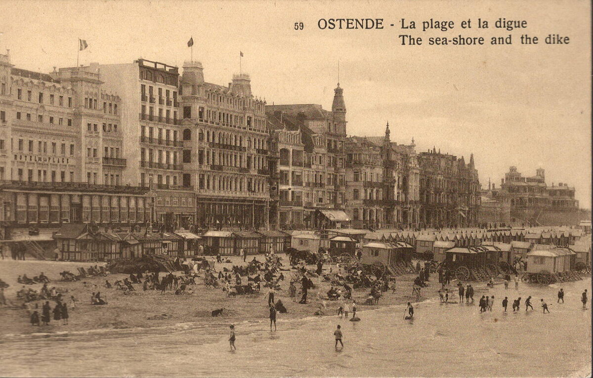 59. - Ostende - La Plage et la digue. The sea-shore and the dike. - Strandrecreatie op het Groot Strand en de traditionele badkarren. We zien de Zeedijk met de grote hotels vanaf de Kursaal richting het Koninklijk Chalet