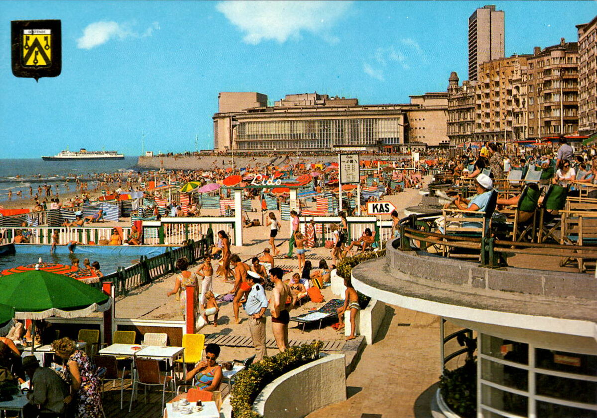 J.V.D.B., N° 102/27. - Oostende - "Kursaal", dijk en strand. - Strandrecreatie op het Groot Strand nabij de badinstallaties onder de Albert I-promenade. Op het einde, de westgevel van de vierde Kursaal. De woontoren "Europacentrum" in de Van Iseghemlaan en een carferry nabij de haven