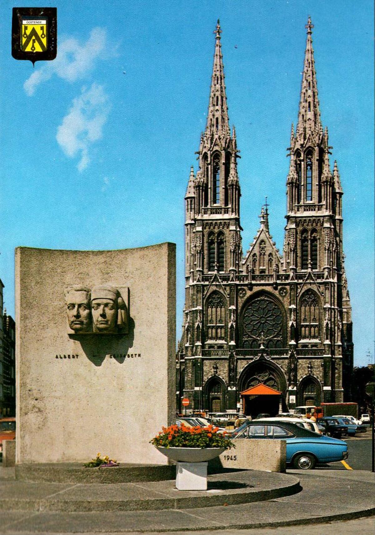 J.V.D.B., N° 102/39. - Oostende - St.- Petrus en Pauluskerk. Gedenkteken Kon. Albert - Kon. Elisabeth. - De Sint Petrus en Pauluskerk nabij het Sint Petrus en Paulusplein. Vooraan, het vernieuwde oorlogsmonument voor de Oostendenaars die de dood vonden in beide wereldoorlogen. In 1968 werd het oorspronkelijke beeld vervangen naar een ontwerp van beeldhouwer August Michiels. Het monument is nu verhuisd nabij de Koninginnekapel in de Jozef II-straat