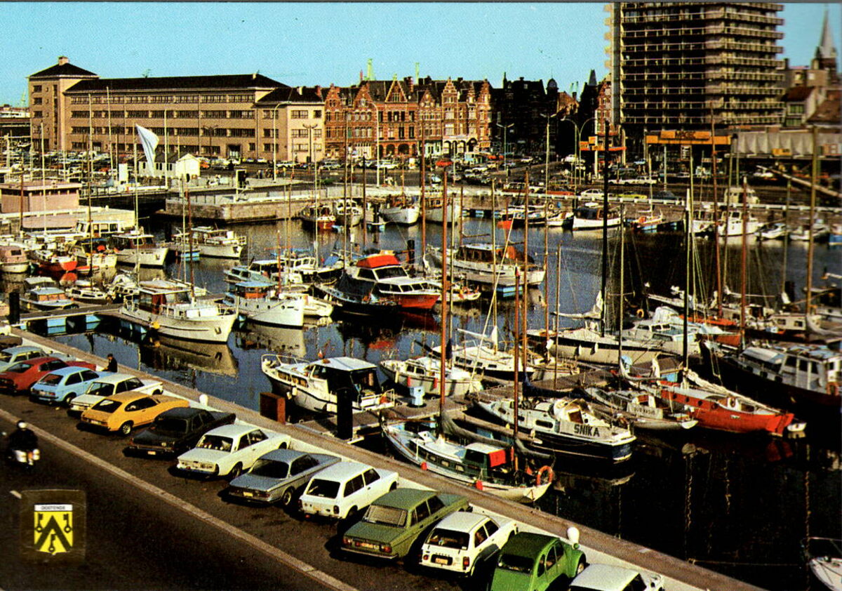J.V.D.B., N° 102/54. - Oostende - "Yacht Club". - Vooraan, geparkeerde auto's in de Vindictivelaan. Pleziervaartuigen in de Mercator jachthaven of tweede handesldok. Achteraan, de Leopold III-laan en de wijk "Hazegras". De woontoren van residentie "De Mast" op het Ernest Feysplein en het Stedelijk Instituut voor Industrie Handel en Hotelwezen