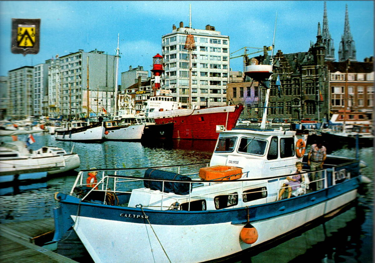J.V.D.B., N° 102/68. - Oostende - Jachthaven. - Pleziervaartuigen en zeiljachten in de Mercator jachthaven of eerste handesldok. Het lichtschip "West-Hinder" als restaurant aan de kade langs de Vindictivelaan. Op de hoek met de Zuidstraat, het gewezen Zeevaartcommissariaat. De vernielingen van de Tweede Wereldoorlog zijn nog zichtbaar
