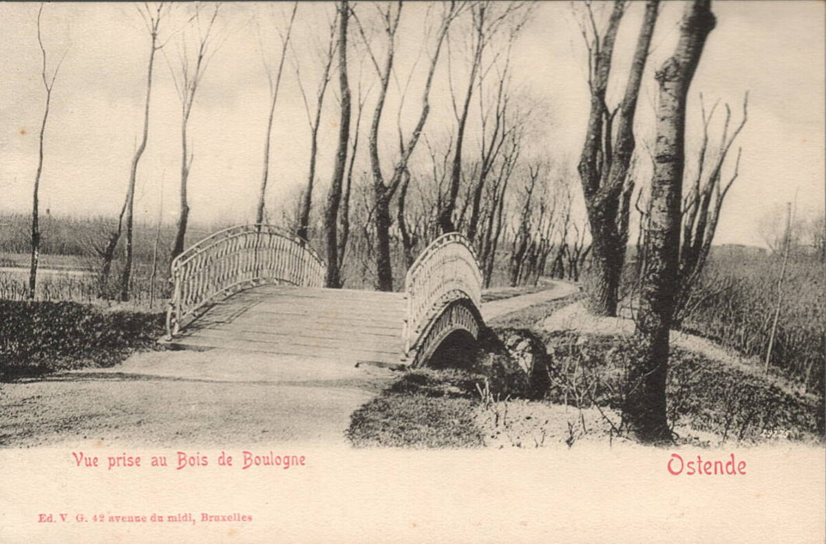 Ed. V.G. [=Victor Grégoire], 42 avenue du midi, Bruxelles. - Ostende - Vue prise au Bois de Boulogne. Eén van de drie wandelbruggen (circa 1905)