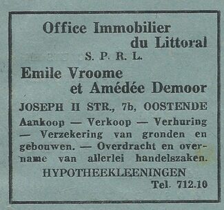 Advertentie : Emile Vroome et Amédée Demoor. Office Immobilier du Littoral. Jozef II-straat 7b, Oostende