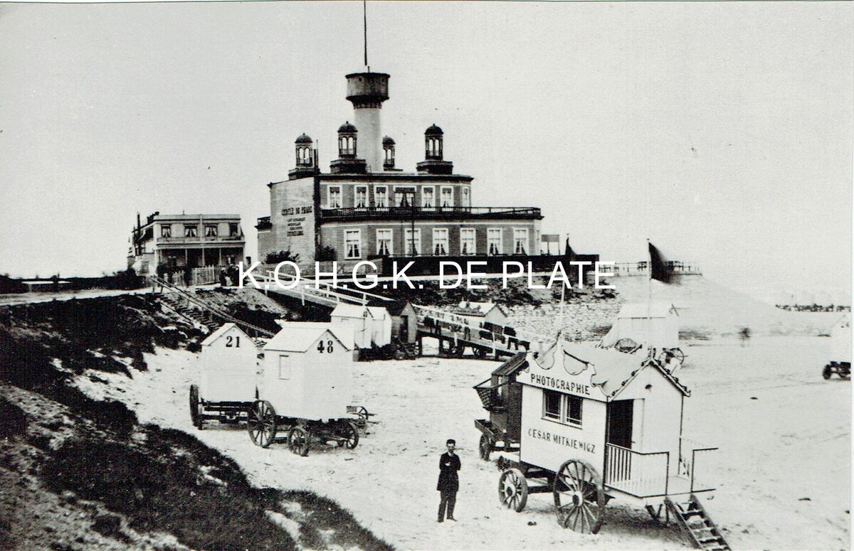 Afdruk. - Formaat : 10,5 x 16 cm. - Omstreeks 1875. Fotograaf Cesar Witkiewicz met zijn verplaatsbare kar op het klein strand. Hij had een zaak te Brussel en een bijhuis in het Hôtel de Flandre te Oostende