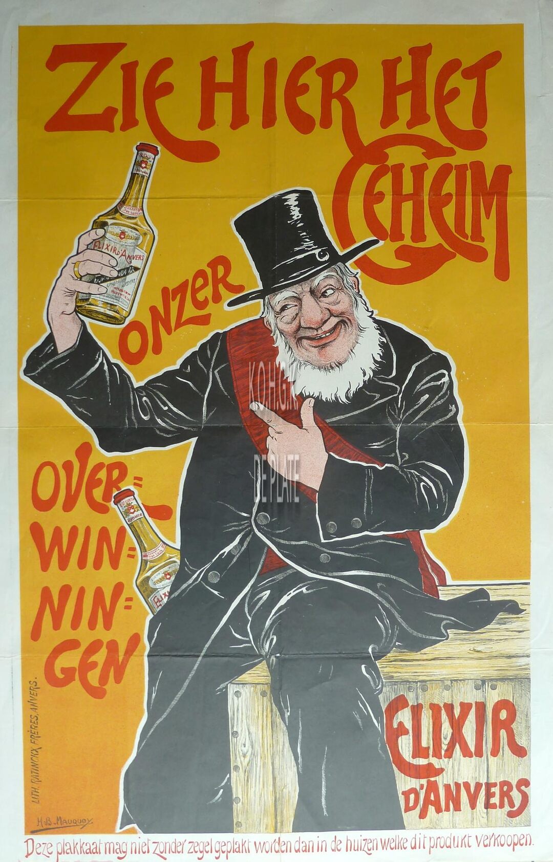 Formaat : 100 x 66 cm. - Exterieuraffiche "Elixir d'Anvers" voor stokerij De Beukelaer, Antwerpen 1900. - Ontwerp : H.B. Mauquoy. - Nota's beschikbaar in pdf