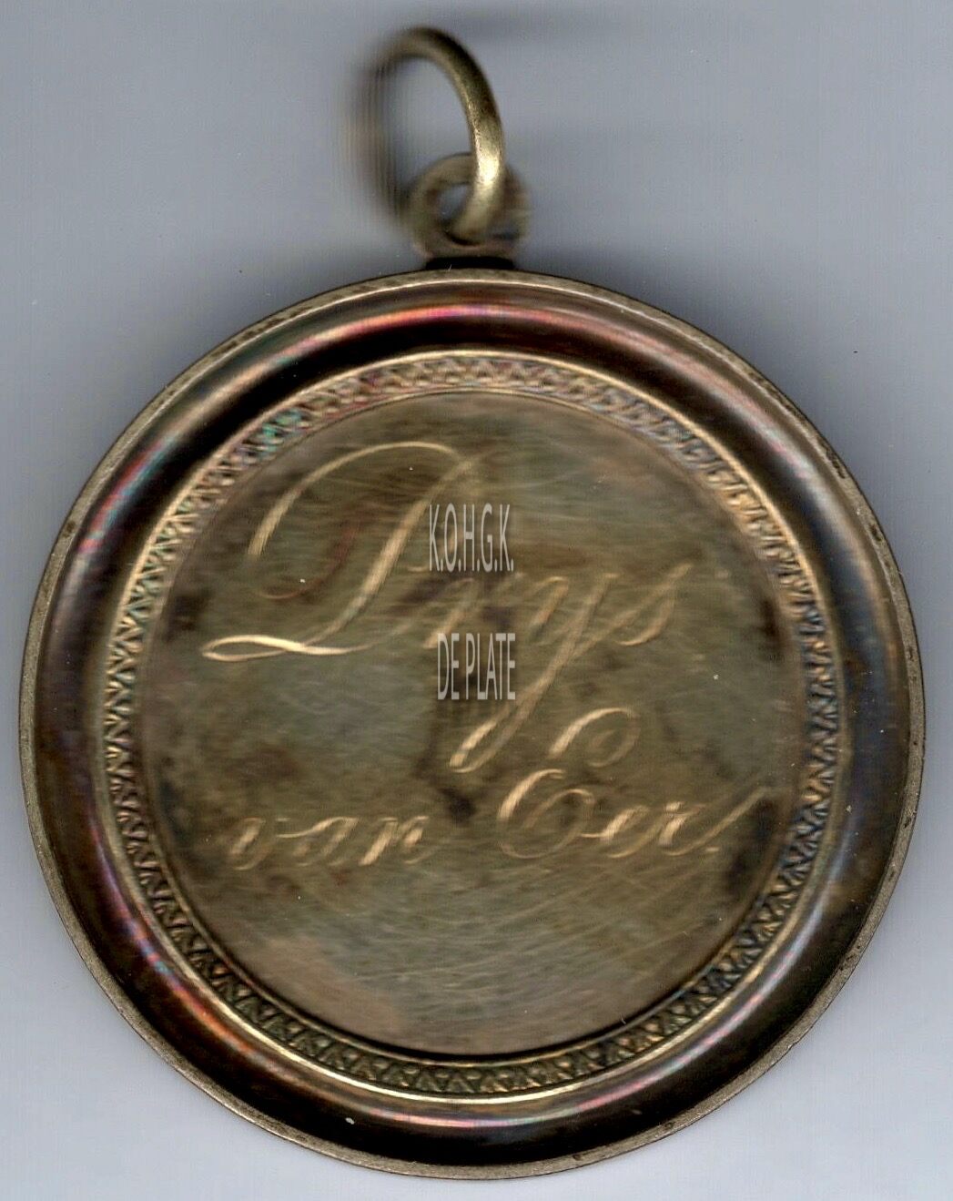 De prijspenning is rond gladde geprofileerde rand in een vatting met oog en ring, en is als volgt ingegraveerd