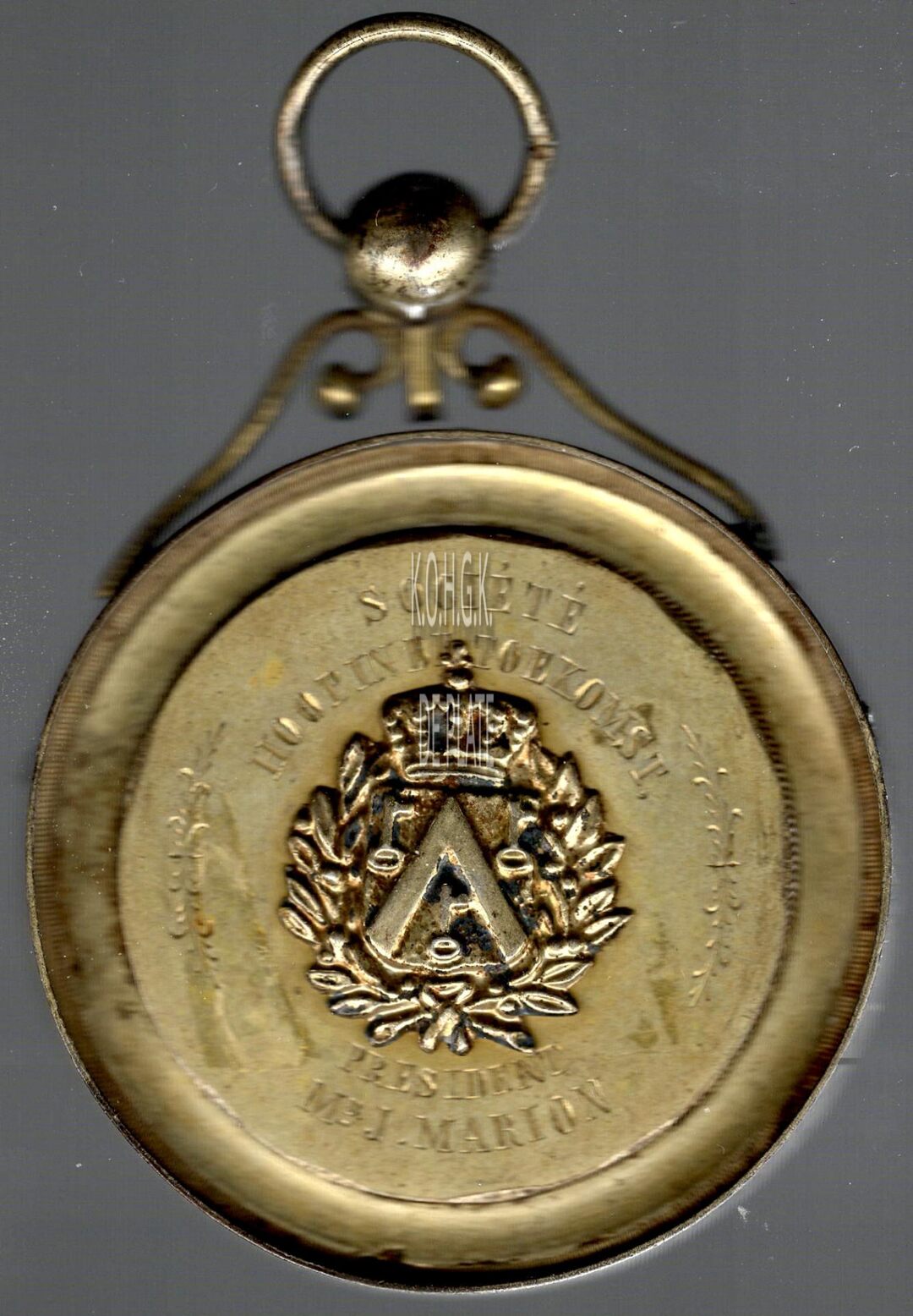Op de voorzijde : rondom boven SOCIETE / HOOP IN DE TOEKOMST, centraal het gekroonde wapenschild met keper en drie sleutels van de stad Oostende, met links en rechts een lauriertak onderaan samengestrikt, rondom onder PRESIDENT MR. J. MARION