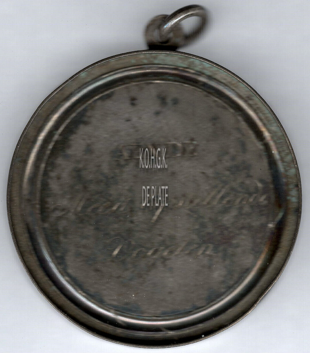De prijspenning is rond in een vatting met geprofileerde rand en parelcirkel, met oog en ring, en is als volgt ingegraveerd:
