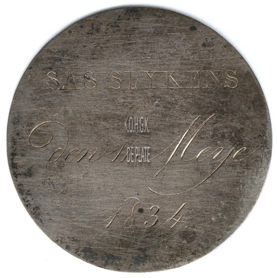 Op de voorzijde : horizontaal SAS SLYKENS / DEN 11 MEYE / 1834