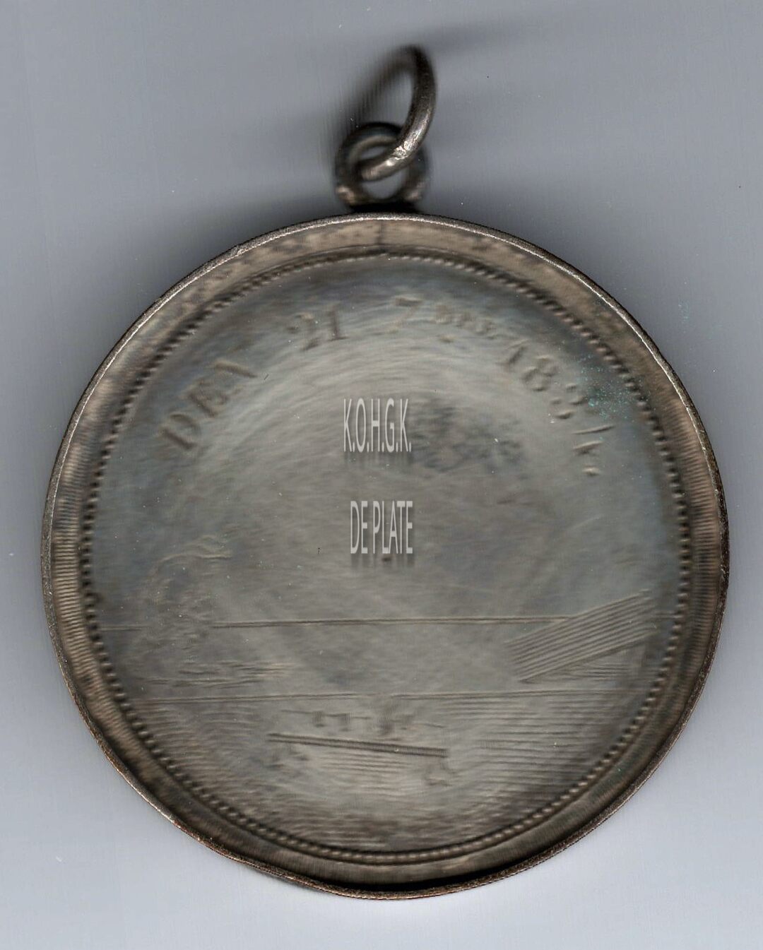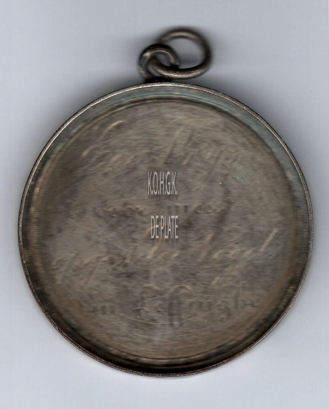 De prijspenning is rond met gladde rand in een vatting met geprofileerde parelrand, oog en ring, en is als volgt ingegraveerd