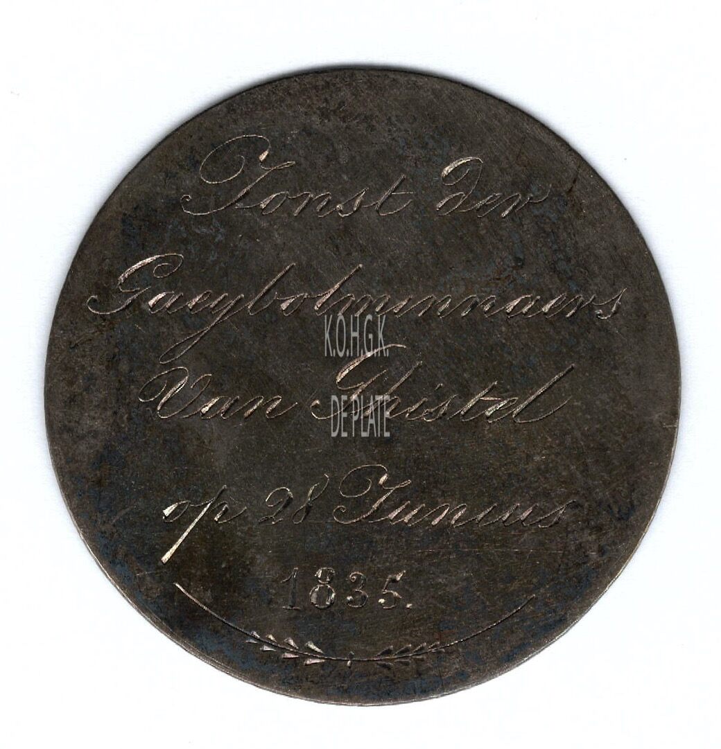 Op de voorzijde : horizontaal JONDST DER / GAEYBOLMINNAERS / VAN GHISTEL / OP 28 JULIUS / 1835