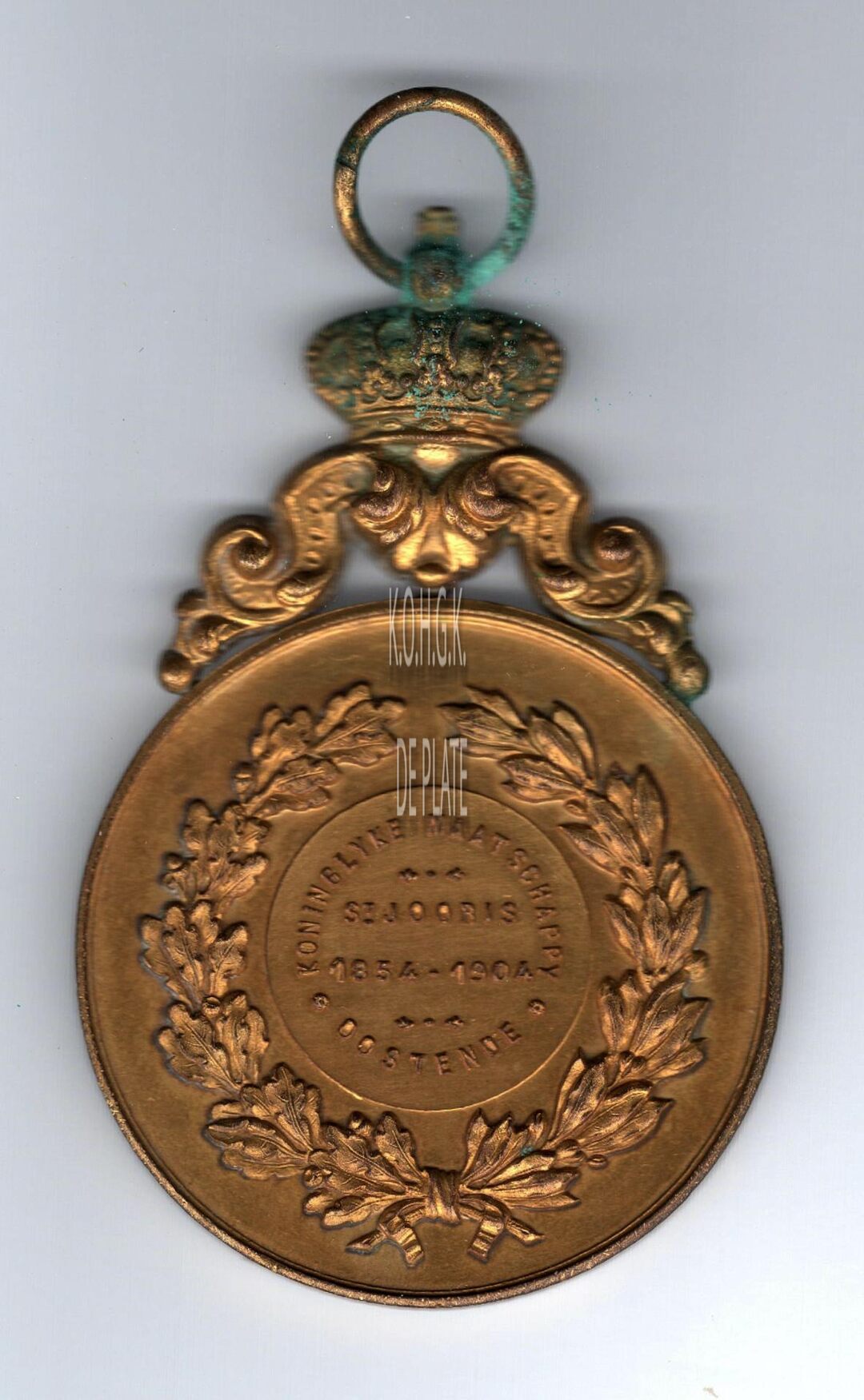 Op de keerzijde : rondom links een eikentak, rechts een lauriertak onderaan samengestrikt, centraal in een binnencirkel rondom boven KONINKLYKE MAATSCHAPPY, horizontaal ★ • ★ / St. JOORIS /1854-1904 / ★ • ★, rondom onder OOSTENDE