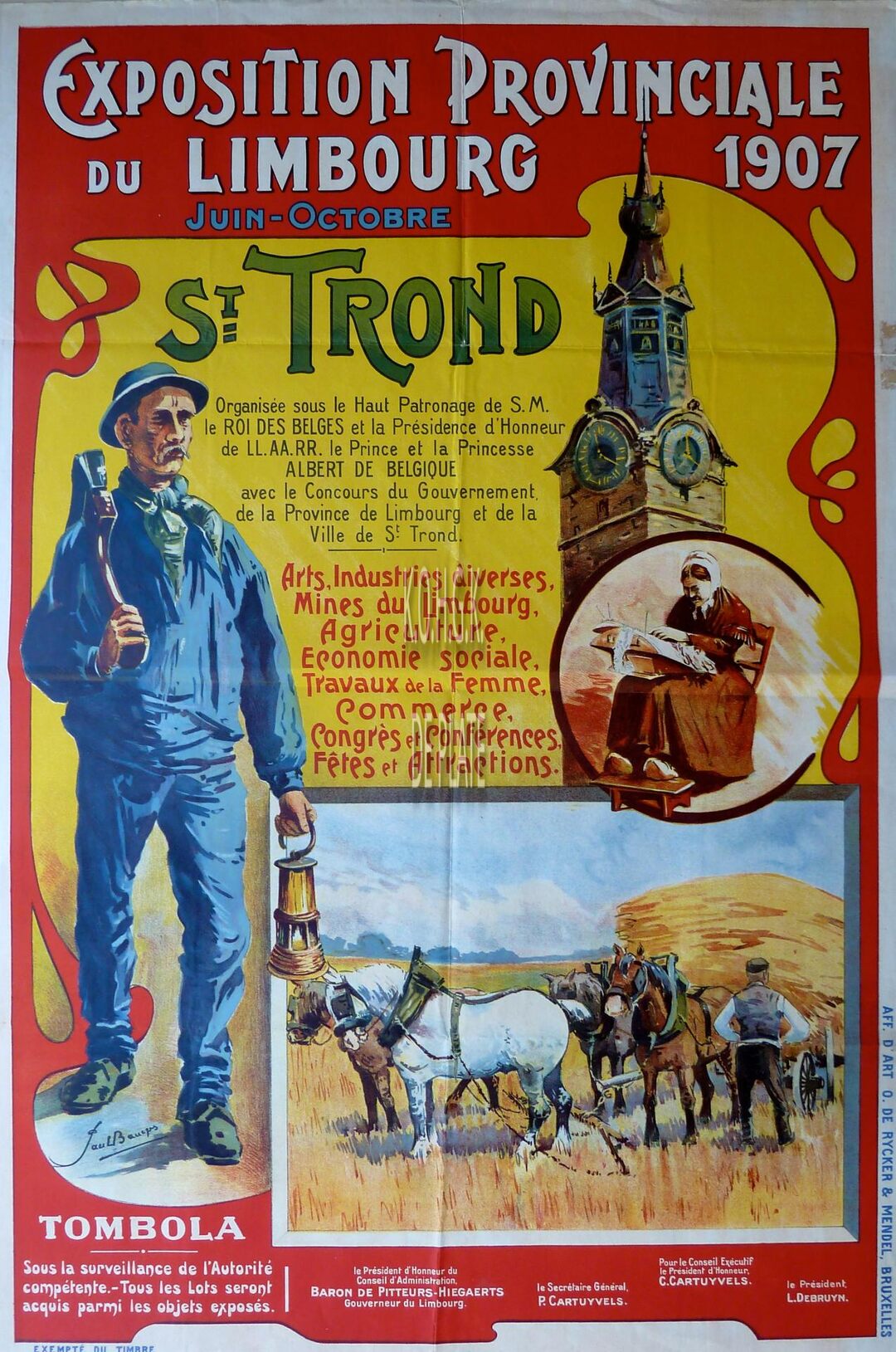Formaat : 119 x 80 cm. - Organisée sous le Haut Patronage de S.M. le Roi des Belges et Présidence d'Honneur de LL. AA. RR. le Prince et la Princesse Albert de Belgique avec le Concours du Gouvernement de la Province de Limbourg et de la Ville de St Trond. Arts, Industries diverses, Mines du Limbourg, Agriculture, Economie sociale, Travaux de la Femme, Commerce, Congrèes et Conférances, Fêtes et Attractions. - Getekend links onder : Paul Bamps. - Nota's beschikbaar in pdf