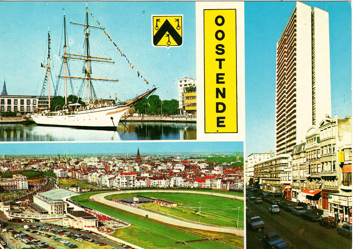 Van Mieghem A., N° 76. - Groeten uit Oostende. Un bonjour de Ostende. Greetings from Ostende. Grüsse aus Ostende. - Inzet : Het zeilschip "Mercator" als museum in het Mercatordok. De Wellingtonrenbaan. Het Europacentrum in de Van Iseghemlaan