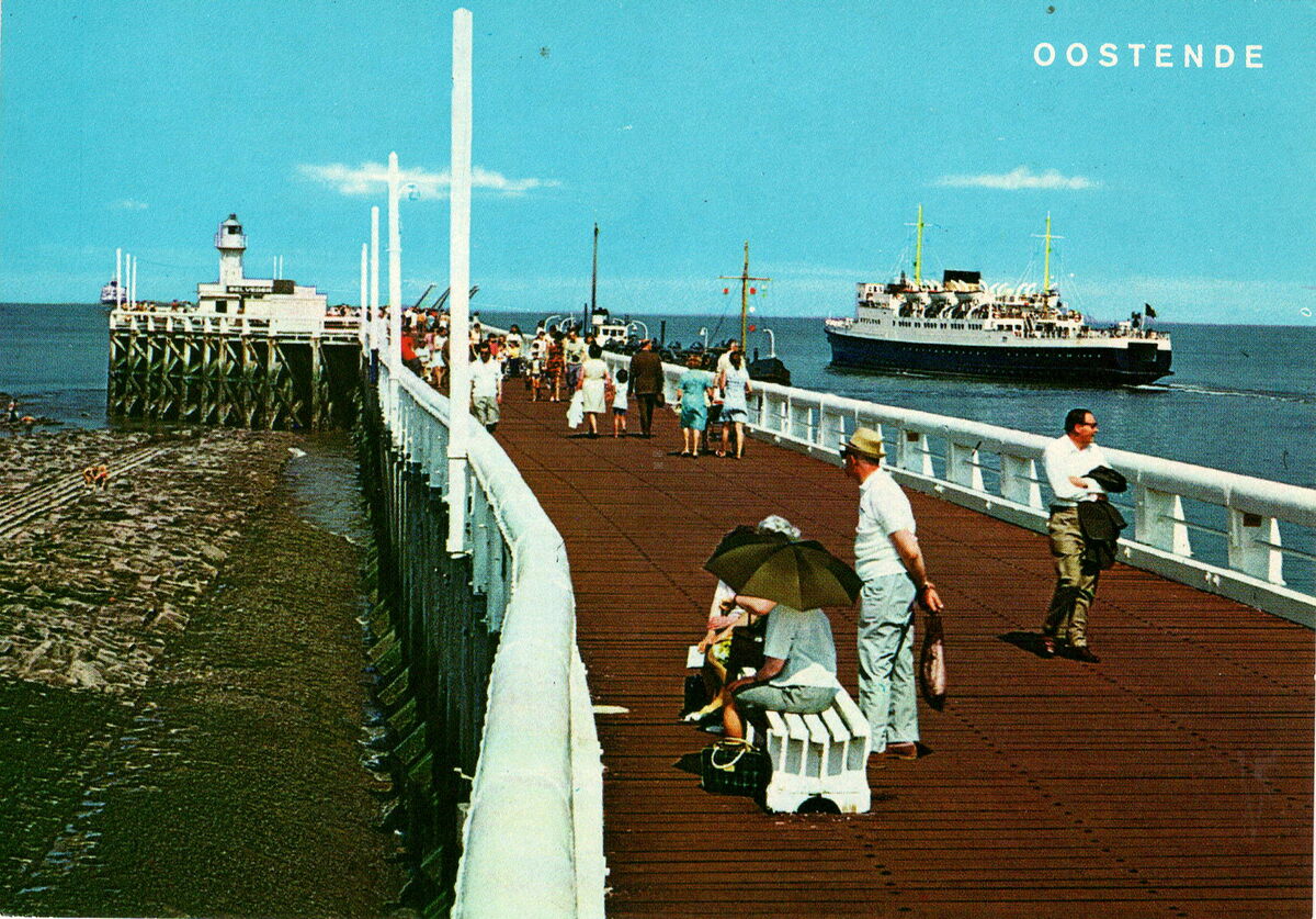 Van Mieghem A., N° 73. - Oostende - Staketsel en Maalboot. Estacade et La malle. Jetty and Mail-boat. Mole und Fährboot. - Het Weststaketsel. Een carferry van de Oostende Dover lijn verlaat de havengeul