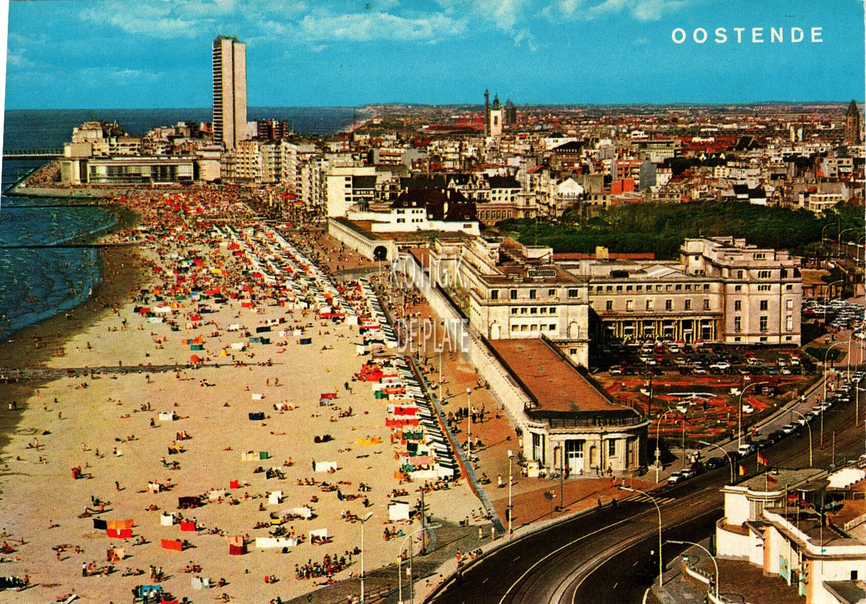 Van Mieghem A., N° 71. - Oostende - Panorama. - Vooraan, de ingang van de Wellingtonrenbaan langs de Koningin Astridlaan. Strandrecreatie op het Groot Strand. De Koninklijke Gaanderijen en het Thermae Hotel langs de Zeedijk. Rechts, het centrum van de stad. Op de achtergrond, de westgevel van de vierde kursaal en de woontoren "Europacentrum" in de Van Iseghemlaan