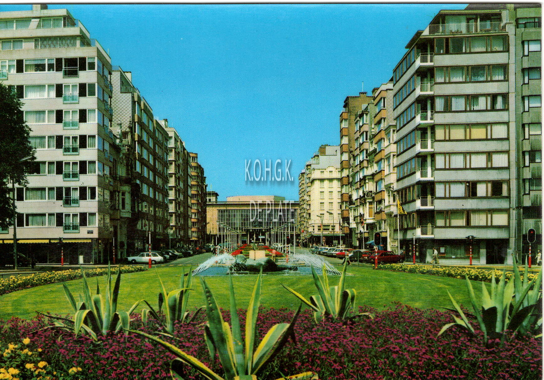 Cromo, N° 101/19. - Oostende - "Leopoldlaan (sic) & Kursaal". - De Leopold II-laan gezien vanaf het beeldhouwwerk "De Zee", in de volksmond "Dikke Mathille" van George Grard, richting de hoofdingang van de vierde kursaal. Vooraan, met de verkeerslichten het kruispunt met de Karel Janssenslaan.