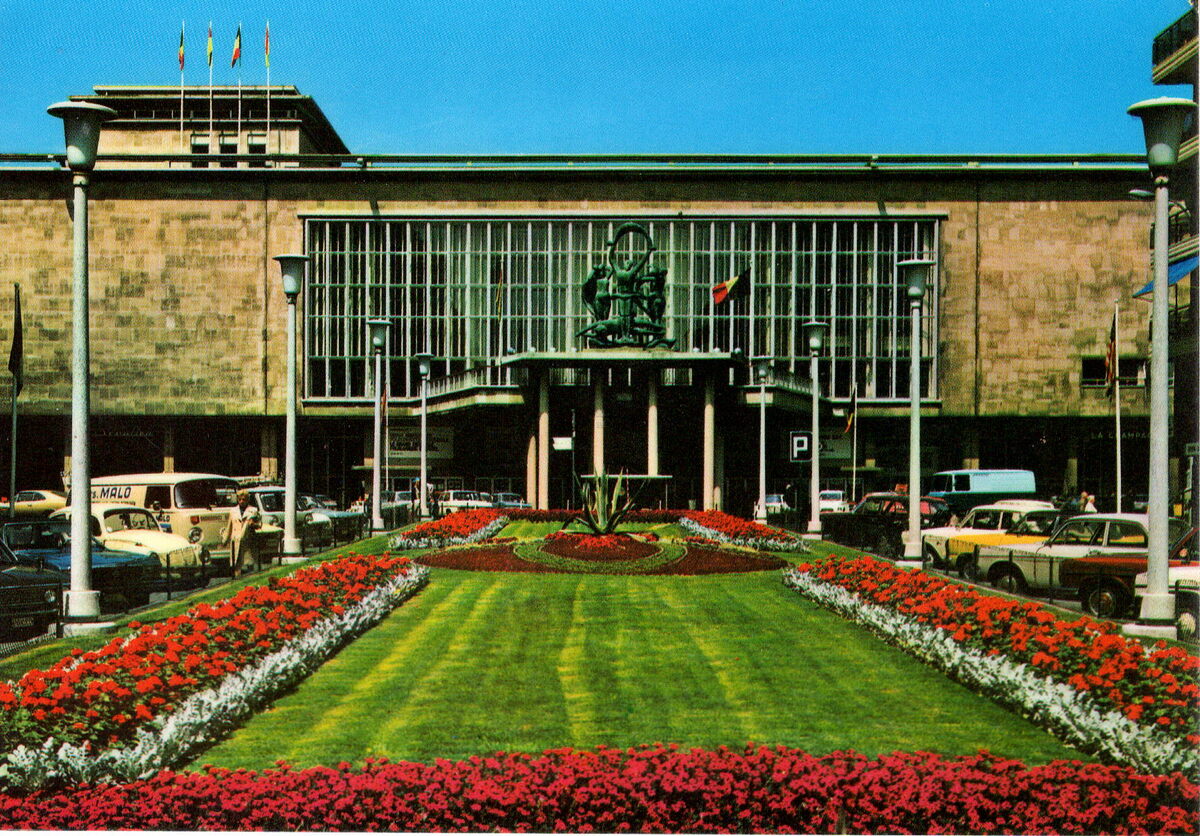 Cromo, N° 101/20. - Oostende - "Kursaal". - De hoofdingang van de vierde kursaal gezien vanuit de Leopold II-laan. Er boven de sculptuur "De Vier Elementen" van Oscar Jespers. Let op de altijd verzorgde bloemenperken door de groendienst van de stad.