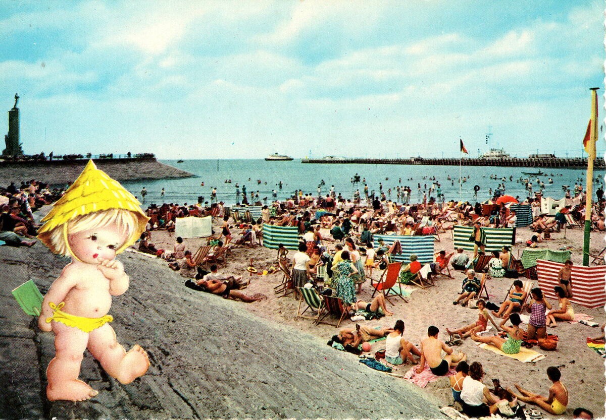 JC, N°12. - Aandenken van Oostende. Souvenir d'Ostende. Souvenir from Ostend. Andenken an Oostende. - Strandrecreatie op het Klein Strand. Rechts, het Weststaketsel en een pakketboot van de Oostende Dover lijn nabij de havengeul. Links, het Nationaal Monument der Zeelieden.