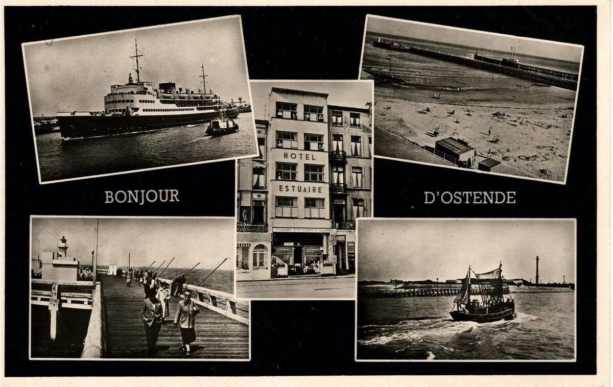 Uitgegeven door : Restaurant "l'Estuaire", 2, Promenade Albert Ier, Ostende. - Inzet : Een pakketboot van de Oostende Daver lijn in de havengeul. Het Klein Strand. Het Weststaketsel. Een kustvissersvaartuig in de havengeul. Het Hotel Estuaire