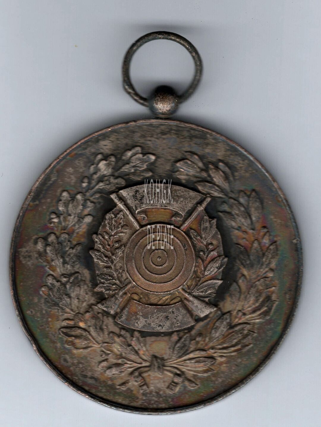 Op de voorzijde : rondom links een eikentak en rechts een lauriertak onderaan samengestrikt, centraal een schietschijf met daarachter twee gekuiste karabijnen, met links een eikentak en rechts een lauriertak
