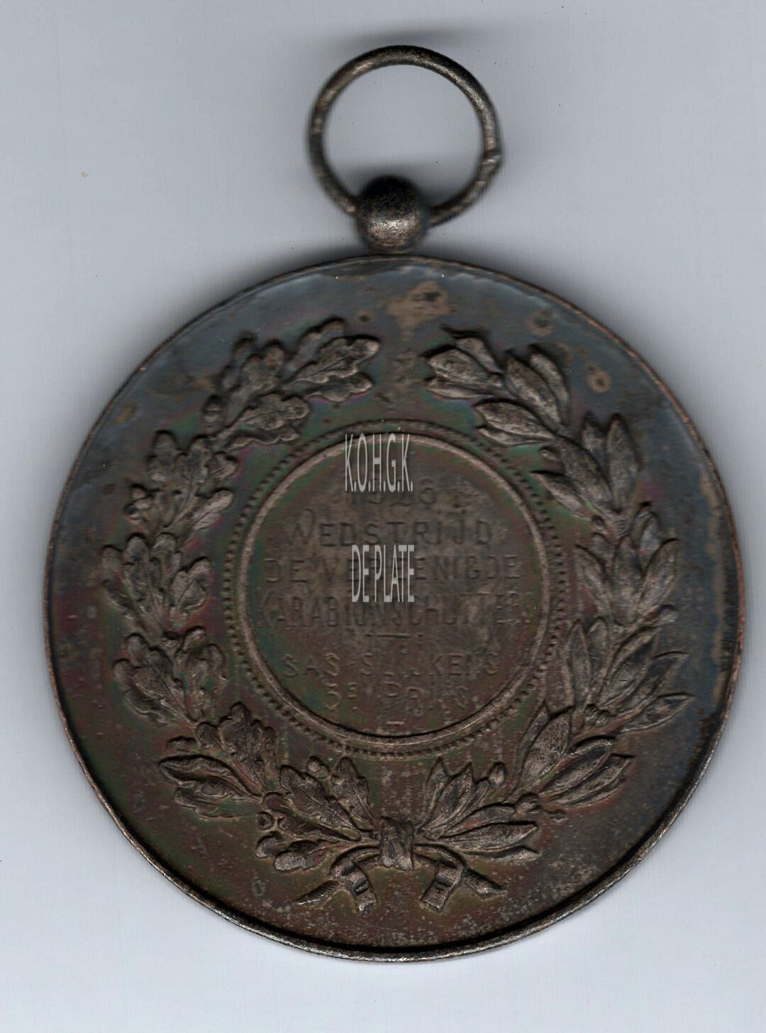 Op de keerzijde : rondom links een eikentak en rechts een lauriertak onderaan samengestrikt, centraal in een binnencirkel met parelrand horizontaal 1926 / WESTRIJD / DE VERENIGDE / KARABIJNSCHUTTERS / SAS SLYKENS / 5DE PRIJS