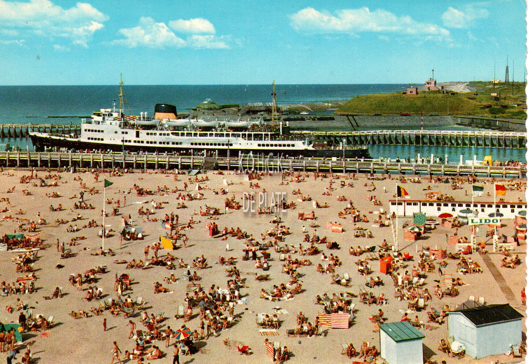 Cromo, Krüger, N° 933/135. - Oostende - Maalboot en Klein strand. La malle et la Petite plage. Mail-boat and Small Beach. Fährboot und Kleiner Strand. - Strandrecreatie op het Klein Strand. Een pakketboot van de Oostende Dover lijn in de havengeul. Op de achtergrond, de oosteroever en het militair domein "De Halve Maan"