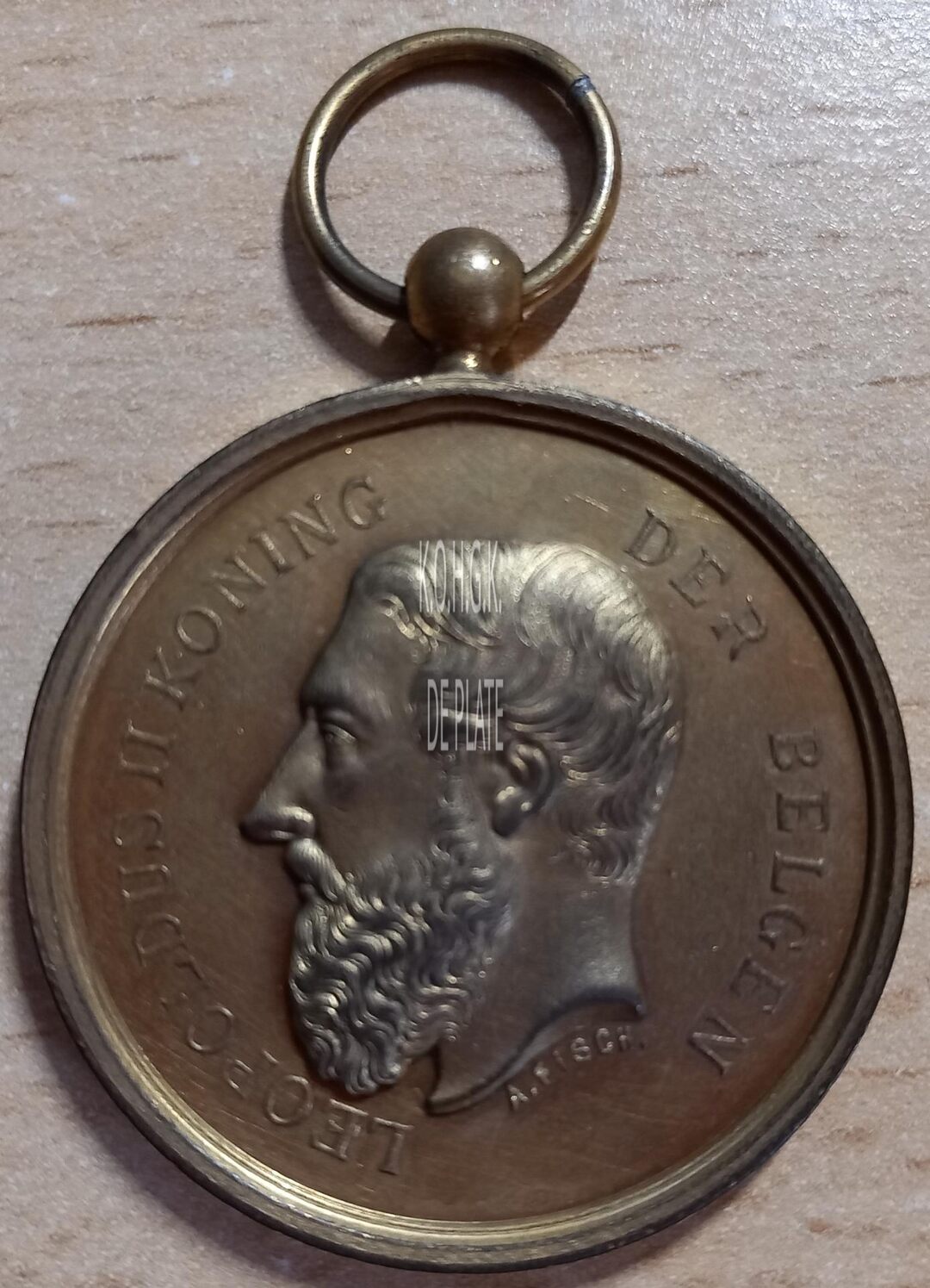 Op de voorzijde : centraal het hoofd van koning Leopold II naar links gericht , rondom links LEOPOLDUS II KONING, rondom rechts DER BELGEN, onder het hoofd gesigneerd A. FISCH