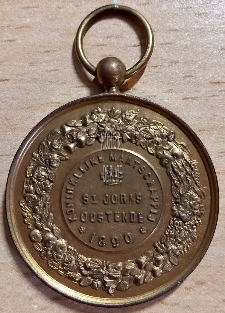 Op de keerzijde : centraal in een ronde cartouche : rondom boven KONINKLIJKE MAATSCHAPPIJ, horizontaal ♚ / ST. JORIS / OOSTENDE, rondom onder ✮ 1890 ✮, rondom de cartouche een gesloten lauwerkrans